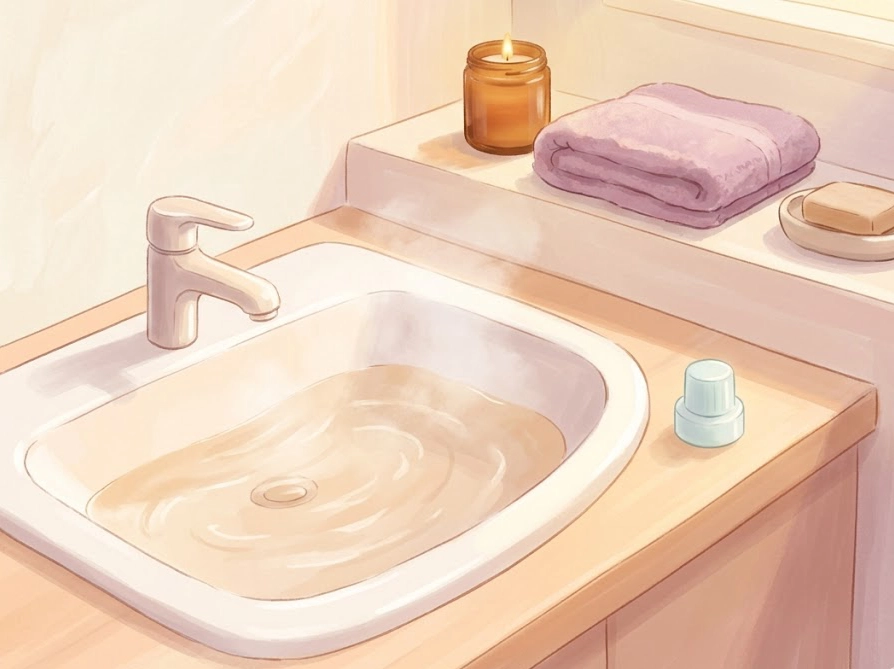 40度〜50度くらいのお湯を洗面器に張ります。お風呂の温度よりやや熱いくらいがベストです。