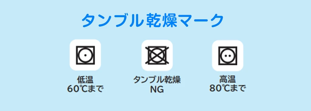 縮みを防ぐために欠かせないのが、洗濯表示(ケアラベル)の確認です。 消費者庁が定めた洗濯表示では、タンブル乾燥の可否が記号で示されています。 四角の中に丸が描かれた記号がタンブル乾燥のマークで、中のドット(点)の数で上限温度がわかる仕組みです。
