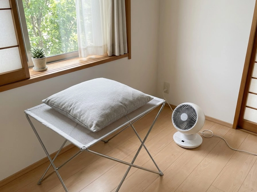 最大のポイントは「平干し」です。 吊り下げると重力で中綿が下に偏り、型崩れの原因になります。 また、直射日光は生地を傷めるため、「風通しの良い日陰」を選びましょう。 2〜3時間おきに裏返したり叩いて空気を含ませると、乾燥が早まります。