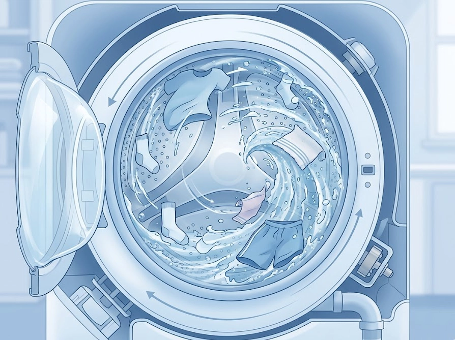 洗濯機はパルセーター(回転羽根)が強力な水流を生み出し、衣類同士をこすり合わせて汚れを落とす構造です。