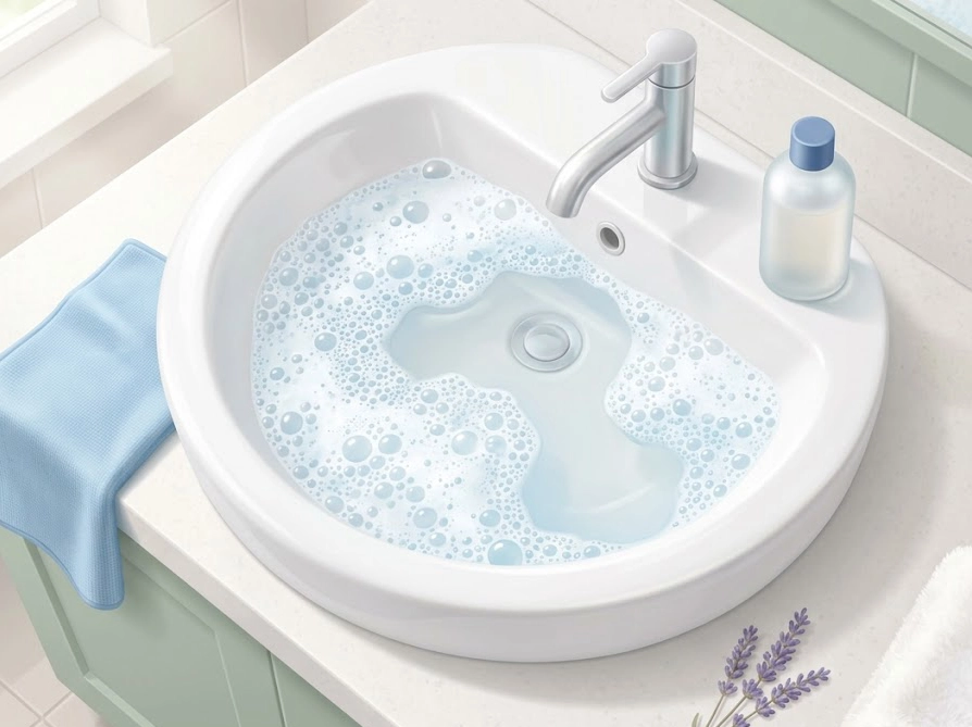 洗面器にぬるま湯を張り、石鹸をたっぷり泡立てます。