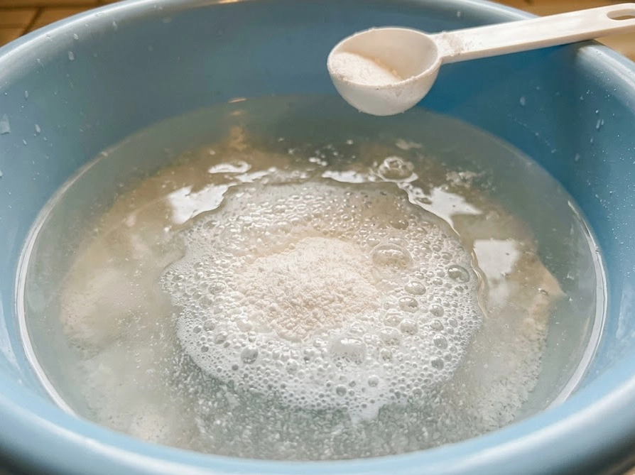 40〜50度のお湯4Lに、オキシクリーン大さじ1と重曹大さじ2をしっかり溶かし切ります。