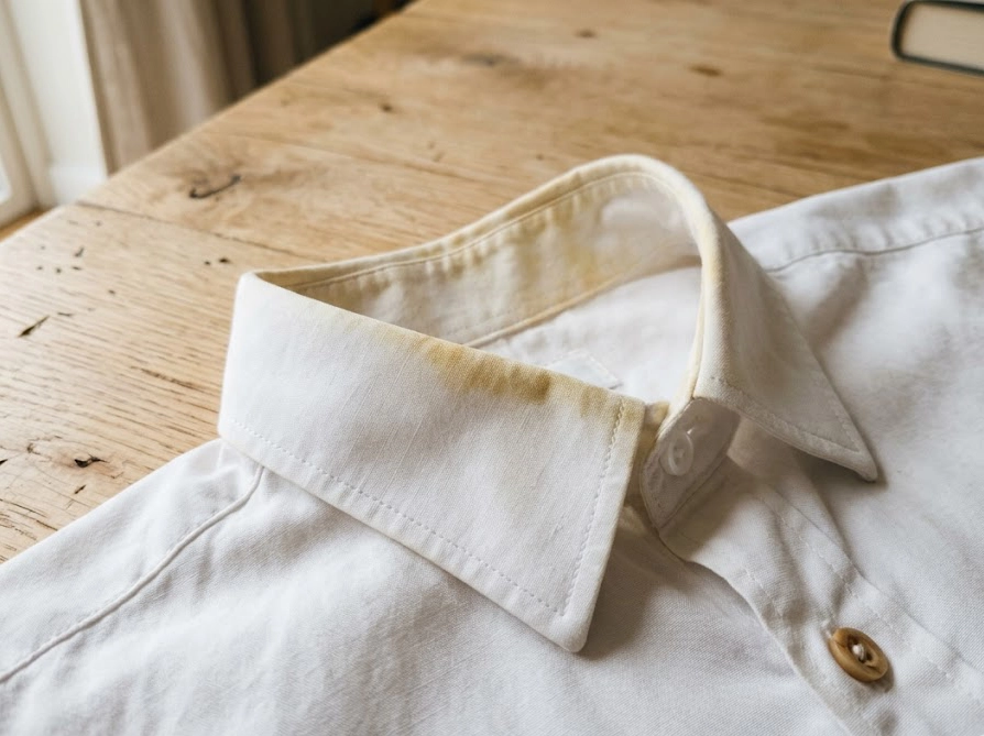 特に直接肌に触れやすい襟元や袖口、脇の下は、皮脂がたっぷり付着するため黄ばみが顕著に出やすい部分です。