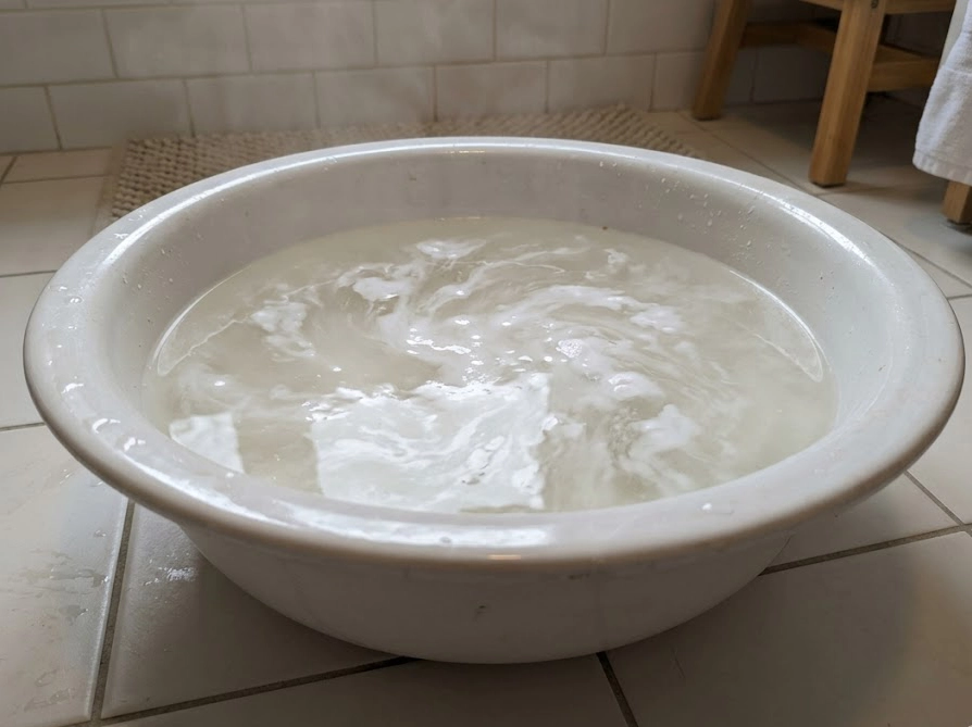 洗面器のぬるま湯に重曹を溶かしている様子の実例写真