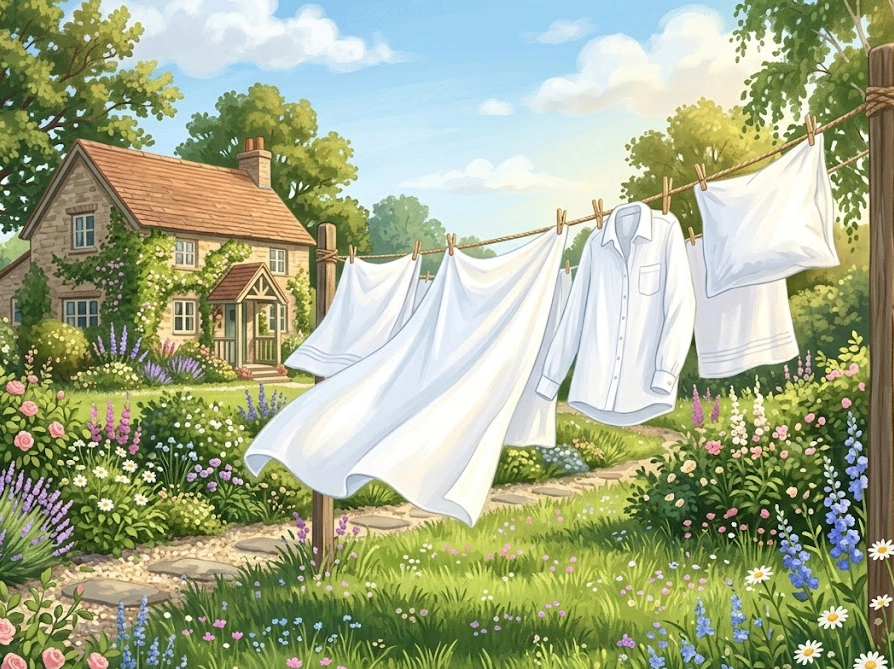 青空の下で気持ちよく乾く白い洗濯物の爽やかなイメージイラスト
